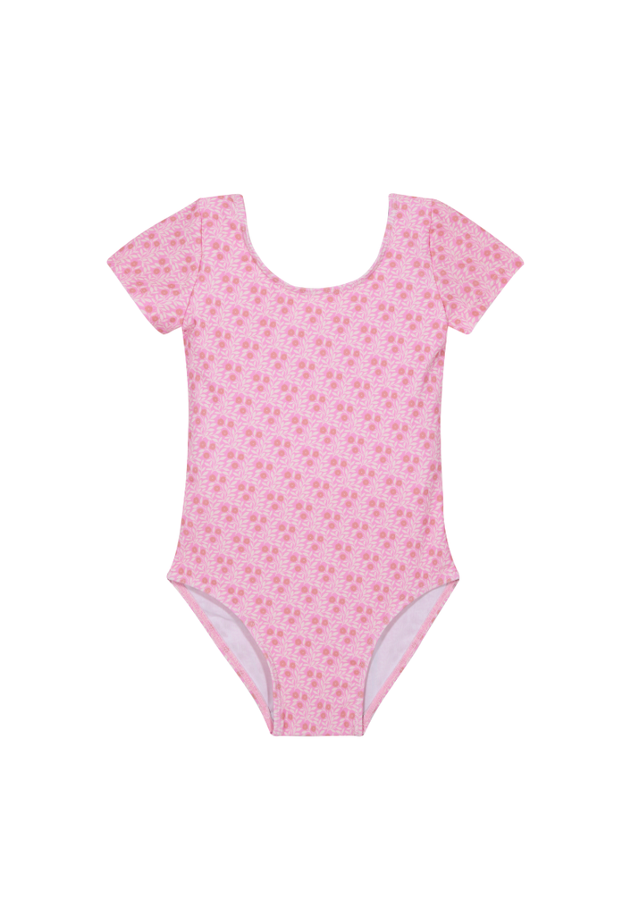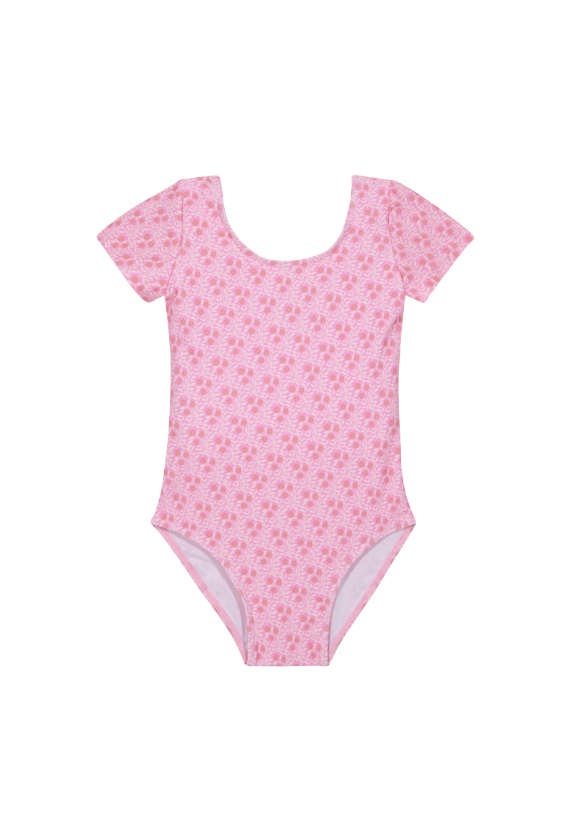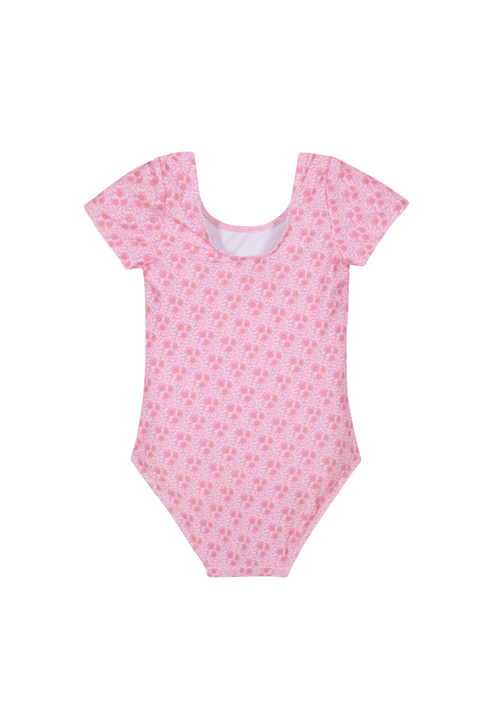 Traje de baño para niña con manga corta, espalda alta y hombros cubiertos para una mayor protección solar sin perder estilo.